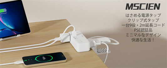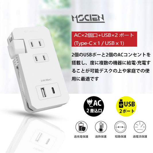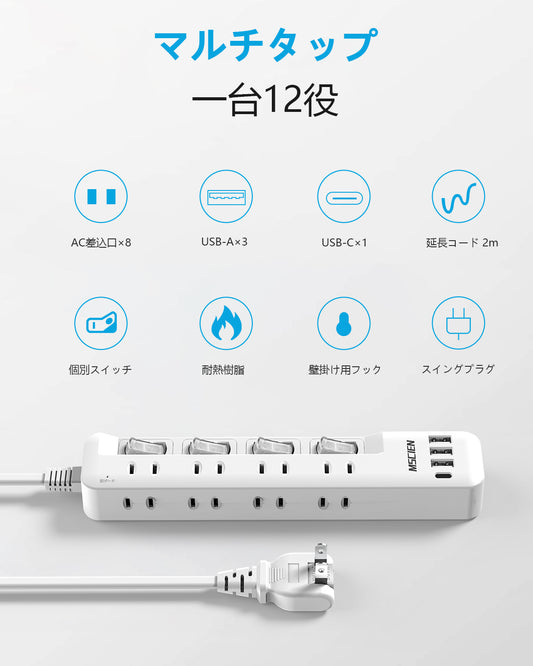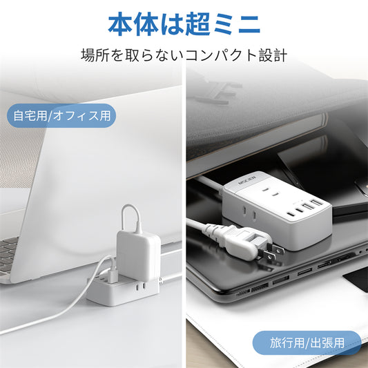 電源タップ コンセント タップ usb ACアダプター 2AC+充電器 急速充電 USB-C 延長コード 過電保護 軽量 コンパクト 旅行 ホワイト 送料無料