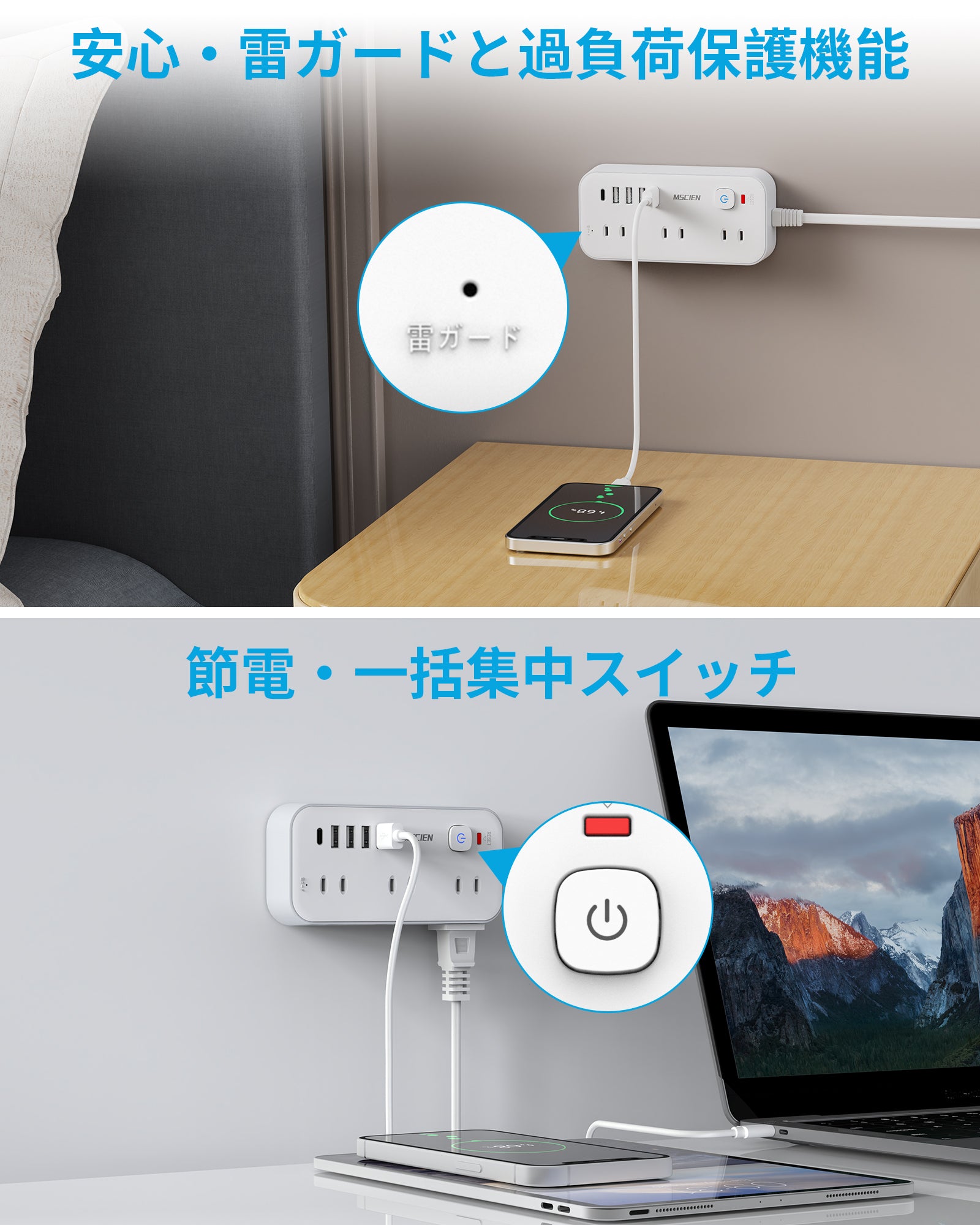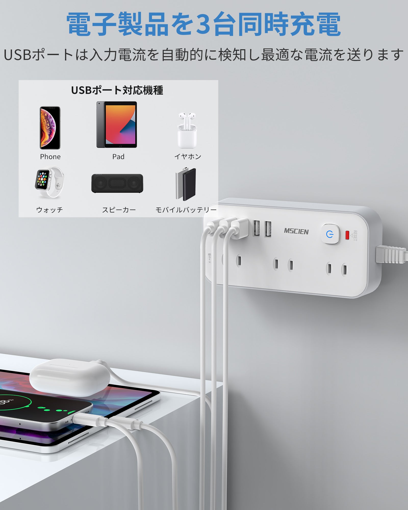 - 電源タップusb:テーブルタップの各USBポート合計3.4 A出力。USB-Aポートは最大5 V/2.4 A出力で、設備に最適な電流を流す。type-cポートは最大5 V/3 A出力で、充電がより便利です。
